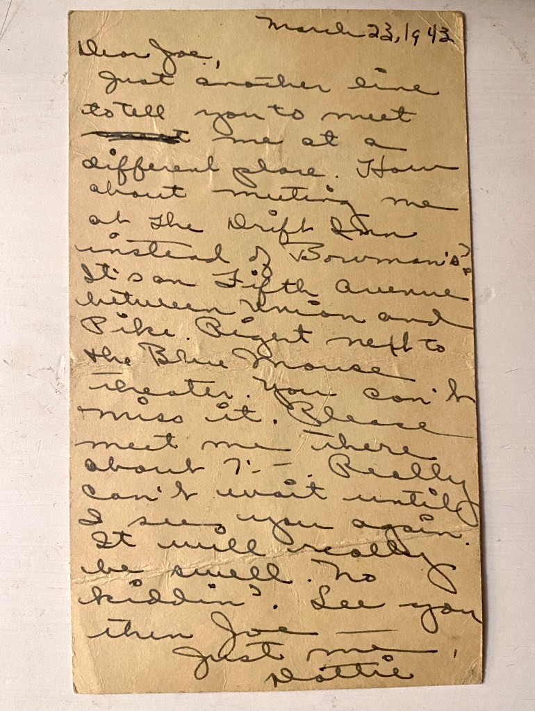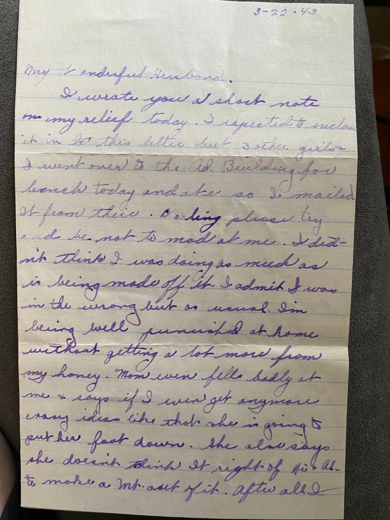 Dearest, I’m so in love with you, dear. I hope and pray all the time that nothing will ever come up to hurt our marriage. Please dear don’t ever forget that our marriage is our whole life. You know I’m very forgiving and understanding but I hope that you don’t figure that you should do things I might not like and take advantage of me. I don’t really think you would ever do anything like that dearest, I guess I’m just sentimental tonight. I’m pretty lonesome and blue. I hope things work out so you can see your way to come out here soon. In one way I’m going to be very very happy to have you near me. But you’ll have to be very careful of the wolves. I know you can be trusted because I trust you with my life.
