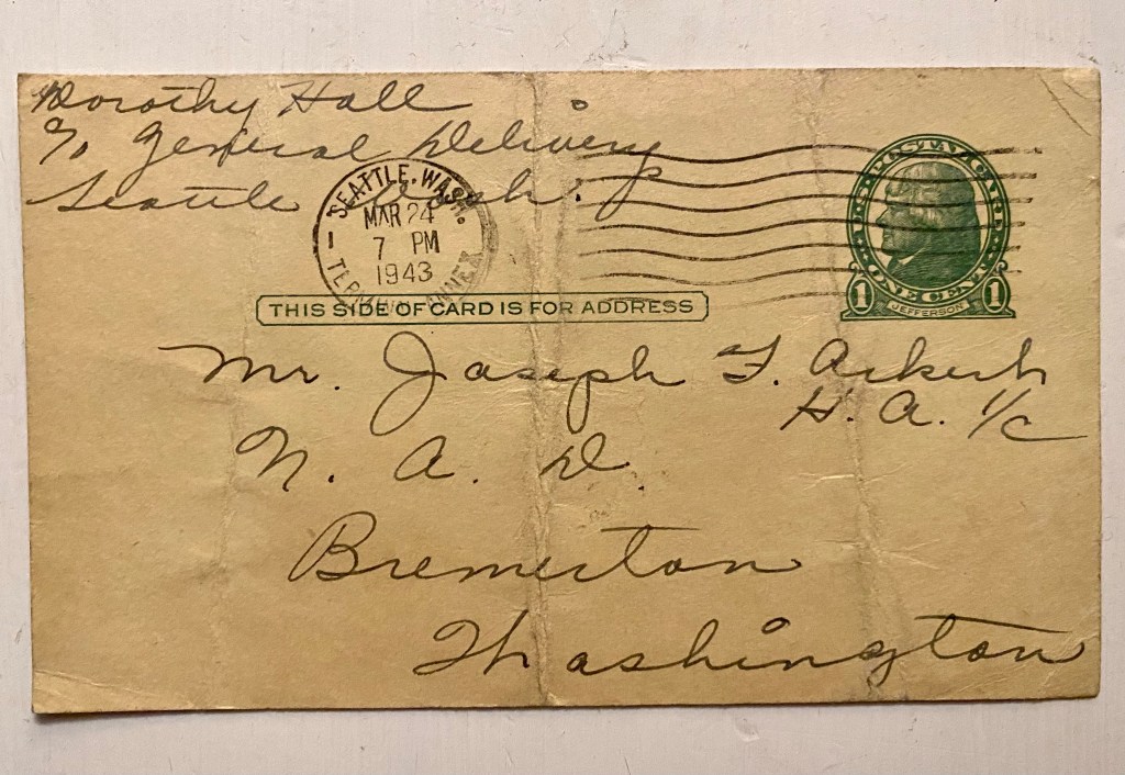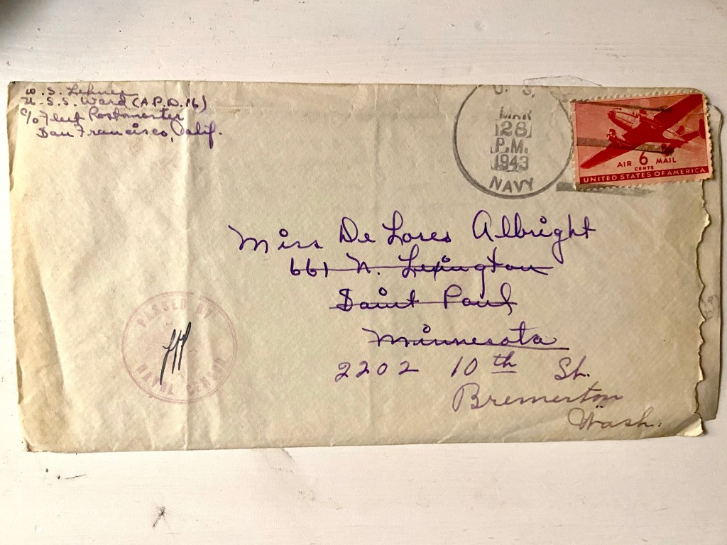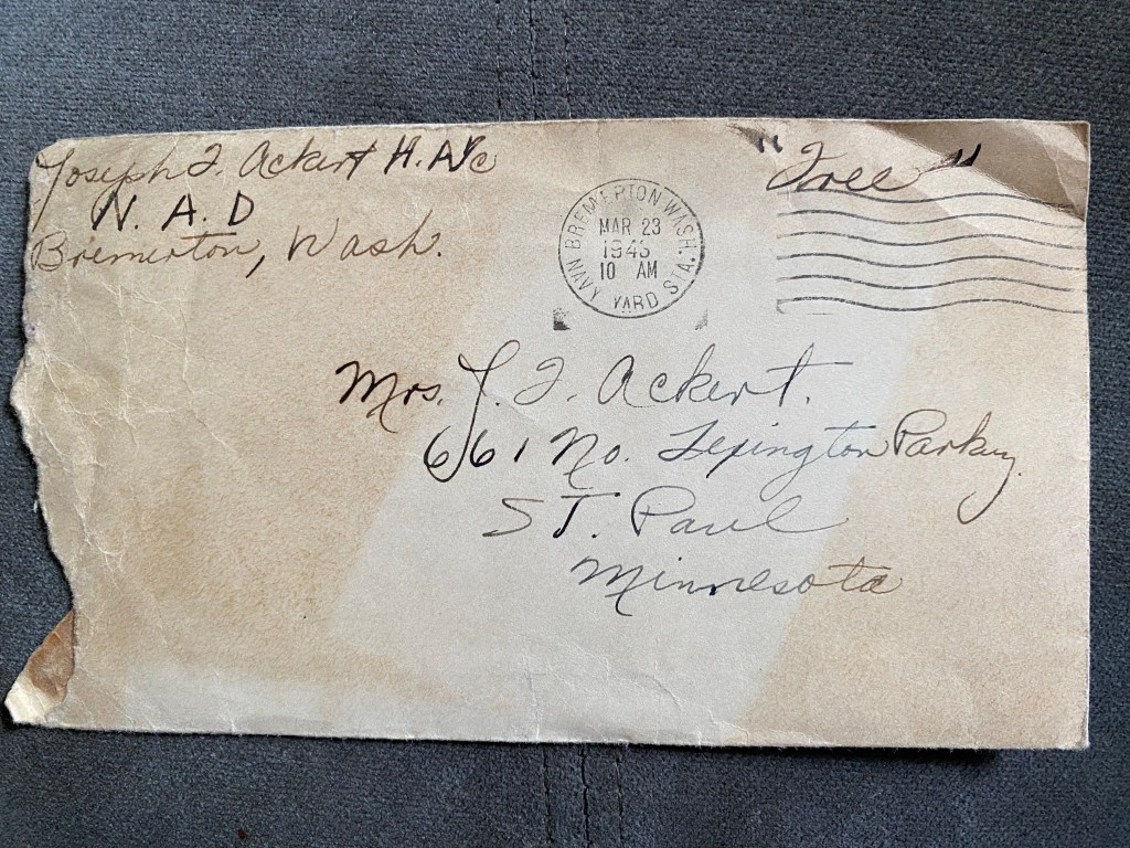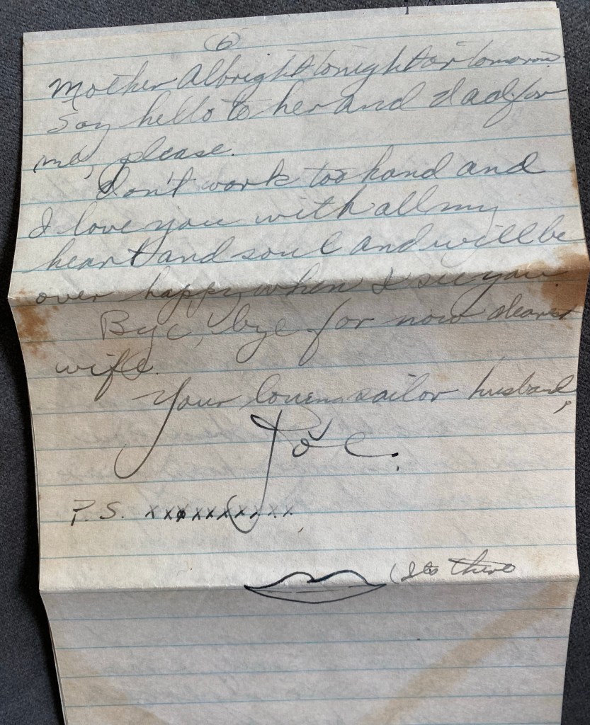 I just received all my mail that was stranded at Farragut. There was about 6 letters from you and the story of my leave. They were swell to read, even if they were a little old.