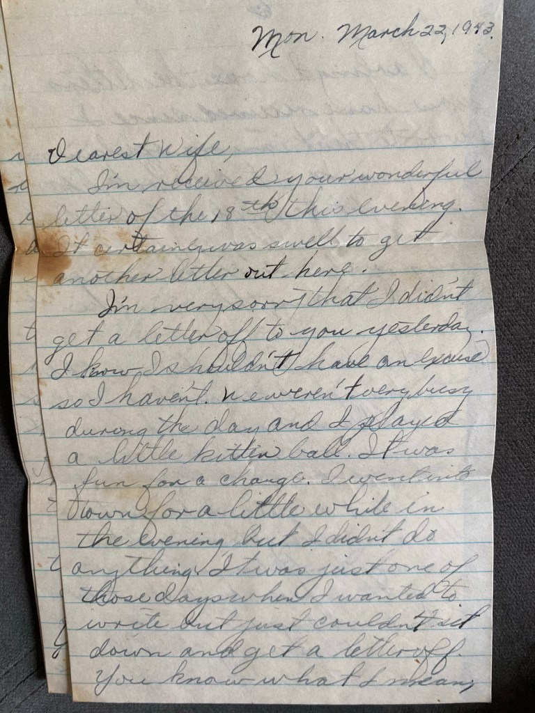 Darling, your story of my leave was really good. It made me laugh as well as cry. You certainly did a good job in writing it up. I’m going to type it up and send you a copy.