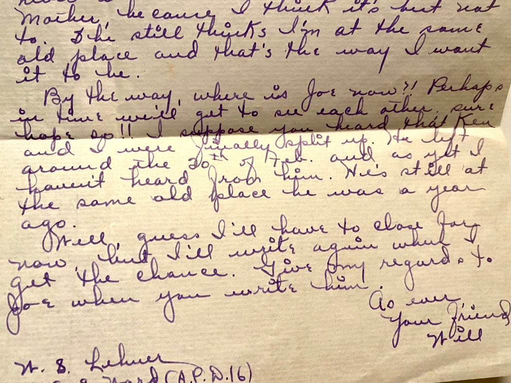 How is everyone back home? I hope fine. In one of the letters you said you had heard from Bud and he had congratulated us. That’s swell. Say hello to him for me next time you write.